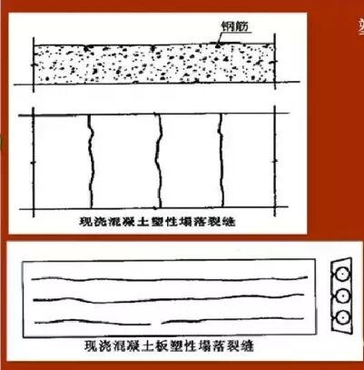 1塑性塌落裂縫塑性塌落裂縫,一般多發(fā)生在混凝土澆注過(guò)程或澆注成型后、混凝土初凝前發(fā)生,由于混凝土拌合物中的骨料在自重作用下緩慢下沉,水向上浮,即所謂的泌水,若是素混凝土,混凝土內(nèi)部下沉是均勻的,若是鋼筋混凝土,則混凝土沿鋼筋下方繼續(xù)下沉,鋼筋上面的混凝土被鋼筋支頂,使混凝土沿鋼筋表面產(chǎn)生順筋裂縫。大流動(dòng)性混凝土或水灰比較大的混凝土塑性塌落裂縫問(wèn)題尤為嚴(yán)重。