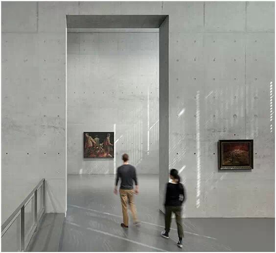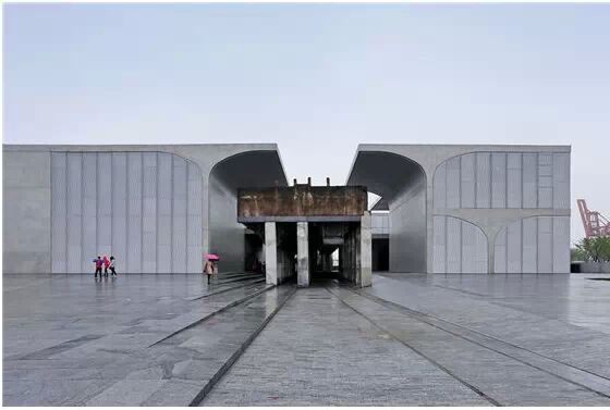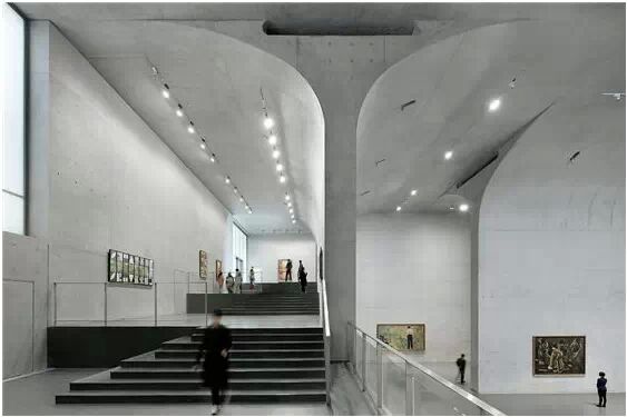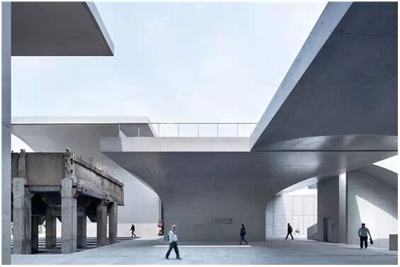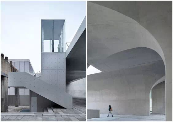 在“傘拱”結構的空腔里,地面以上的“傘拱”覆蓋空間,墻體和天花均為清水混凝土的表面,它們的幾何分界位置也變得模糊。這樣的結構性空間,在形態(tài)上不僅對人的身體形成庇護感,亦與保留的江邊碼頭的煤料斗產(chǎn)生視覺呼應。建筑的內部空間也得以呈現(xiàn)一種原始的野性魅力,而有著大小調節(jié)的空間尺度以及留有模板拼縫和螺栓孔的清水混凝土表面又會帶來一種現(xiàn)實感。這種“直白”式的結構、材料、空間所形成的直接性與樸素性,加上大尺度出挑所產(chǎn)生的力量感或輕盈感,使整個建筑與原有場地的工業(yè)特質間取得一種時間與空間的接續(xù)關系。地面以上的清水混凝土“傘拱”下的流動展覽空間和地下一層傳統(tǒng)“白盒子”式的展覽空間由一個呈螺旋回轉、層層跌落的階梯空間聯(lián)接,既原始又現(xiàn)實的空間和古代、近代、現(xiàn)代直到當代藝術的展覽陳列,這種并置的張力,呈現(xiàn)出一種具有時間性的展覽空間。