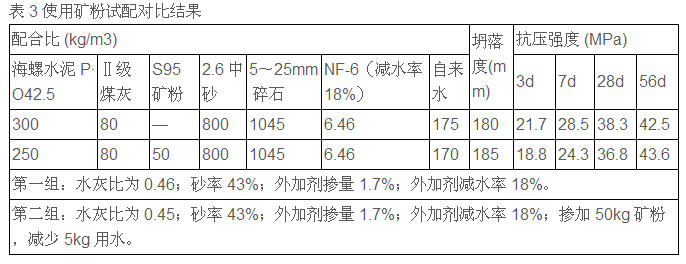 磨細(xì)礦粉能延緩膠凝材料的水化速度,延長凝結(jié)時(shí)間,尤其在炎熱的夏季及大體積混凝土應(yīng)用中有明顯效果。另外礦粉具有改善混凝土工作性,改善混凝土的內(nèi)部結(jié)構(gòu),提高抗?jié)B和抗腐蝕的能力,這些都有大量試驗(yàn)證明。因?yàn)樗嗯c礦粉存在部分差價(jià),利用礦粉后期增強(qiáng)效果,既可以降低水化熱,減少裂縫的產(chǎn)生,又可以使混凝土后期強(qiáng)度不變或更高。如表3。