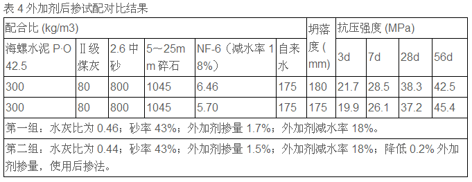 精確的計(jì)量是保證配合比準(zhǔn)確的前提,因此應(yīng)定期對攪拌機(jī)各配料秤進(jìn)行校稱,保證其精確度,使各材料用量在允許范圍之內(nèi),避免材料的浪費(fèi)。通過對設(shè)備的改造,使用后摻法分次加入外加劑。比如:先加入10% 的減水劑和 80% 的水,后加入 90% 的減水劑和 20% 的水。這樣就可以使水泥先進(jìn)行部分水化,避免了外加劑中的有效成分被迅速吸附,造成外加劑的浪費(fèi)。利用后摻分次加入外加劑可以降低部分外加劑的摻量,從而降低部分成本,并提高外加劑與水泥的適應(yīng)性,尤其在炎熱的夏季減少坍落度的損失。見表4。