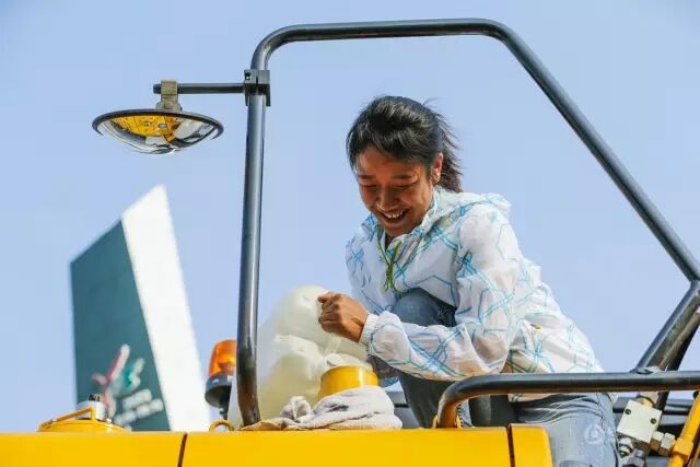 丁旭來到戶外練習(xí)場后,仔細(xì)將夏季用的柴油灌入挖掘機中,旁邊的同事提醒說:“可別灑出來”,讓她不禁靦腆地笑起來。