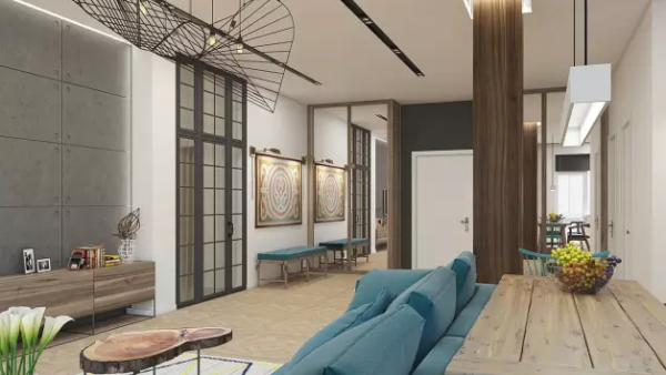 由于這間公寓的采光非常良好,大量使用工業(yè)風(fēng)元素,像是水泥粉光地板、裸露天花管線、不銹鋼廚房臺(tái)面,也不會(huì)感到冰冷,反而在木地板、木作家具的襯托下,搭配原木百葉透進(jìn)的光線,呈現(xiàn)原始質(zhì)樸的感覺。