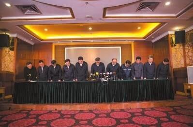 25日,深圳市委書(shū)記馬興瑞(左六)和市長(zhǎng)許勤(左七)等深圳市和光明新區(qū)領(lǐng)導(dǎo)在發(fā)布會(huì)上鞠躬道歉。
