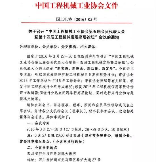 茲定于2016年3月27~30日在四川瀘州市召開(kāi)“中國(guó)工程機(jī)械工業(yè)協(xié)會(huì)第五屆會(huì)員代表大會(huì)暨第十四屆工程機(jī)械發(fā)展高層論壇”。會(huì)員代表大會(huì)的主題是“新常態(tài)、新理念、新動(dòng)能、新發(fā)展”。會(huì)議的主要內(nèi)容:聽(tīng)取國(guó)家宏觀經(jīng)濟(jì)和工程機(jī)械行業(yè)發(fā)展形勢(shì)報(bào)告;審議協(xié)會(huì)2015年工作總結(jié)和2016年工作計(jì)劃;審議協(xié)會(huì)換屆等有關(guān)議案;頒發(fā)中國(guó)工程機(jī)械行業(yè)終身成就獎(jiǎng);頒發(fā)2015年工程機(jī)械信用等級(jí)評(píng)價(jià)證書和牌匾;圍繞行業(yè)熱點(diǎn)問(wèn)題舉行高層論壇,同時(shí)進(jìn)行分行業(yè)和專題情況交流等。