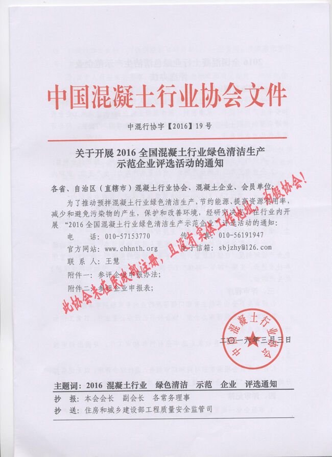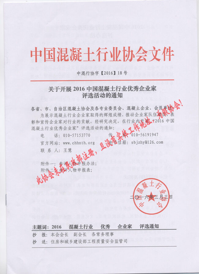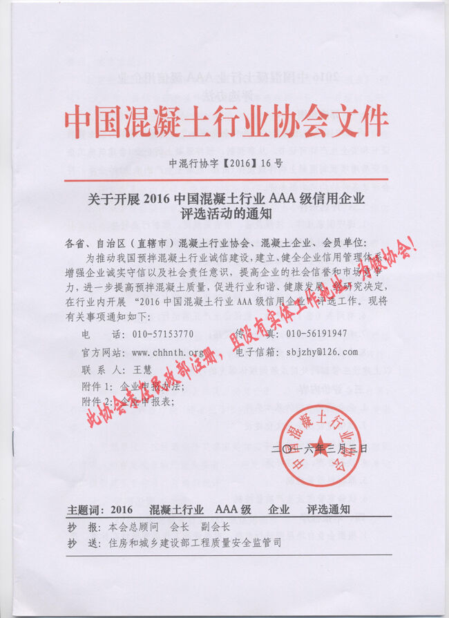 近日,有多家省市協(xié)會(huì)和有關(guān)生產(chǎn)企業(yè)向分會(huì)秘書處反映收到“中國混凝土行業(yè)協(xié)會(huì)”2016(16、17、18、19、20)文件開展所謂的“中國混凝土行業(yè)評選活動(dòng)”的通知。