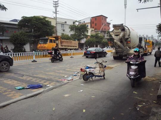 據(jù)了解,元華路是福清市區(qū)通往元洪投資區(qū)一條重要交通主干道,平時來往的車流量眾多。昨日下午1時許,記者趕到現(xiàn)場看到,一輛車牌號為閩DB9072的混凝土車仍停在現(xiàn)場,慘遭碾壓的女子和小女孩已被運走。民警仍在現(xiàn)場調查,現(xiàn)場的血跡已用沙土覆蓋,電動車車頭已嚴重變形。