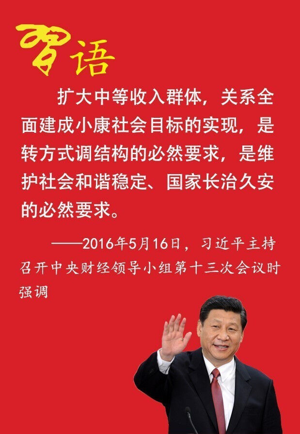 2016年5月16日,習近平主持召開中央財經(jīng)領(lǐng)導小組第十三次會議,分別研究落實供給側(cè)結(jié)構(gòu)性改革、擴大中等收入群體工作。他強調(diào)要堅持以人民為中心的發(fā)展思想,在全社會大力弘揚勤勞致富、艱苦奮斗精神,激勵人們通過勞動創(chuàng)造美好生活,不斷提高生活水平。