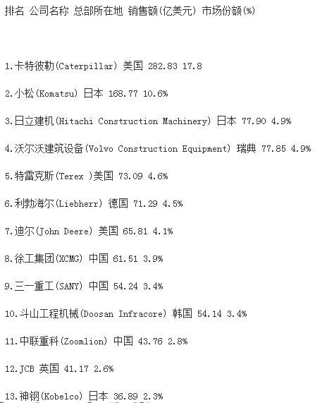 從表單中不難看出,卡特彼勒、小松的世界排名相對穩(wěn)定,仍然位居第一、第二名。其中卡特彼勒占總市場收入的18.1%。較之2015年,特雷克斯上升兩個名次,位居第三位。特雷克斯取代日立排名第三,日立建機排名第四,利勃海爾位列第五,沃爾沃排名第六。除此之外,斗山和杰西博分別上升兩個名次,擠進(jìn)前十名。
