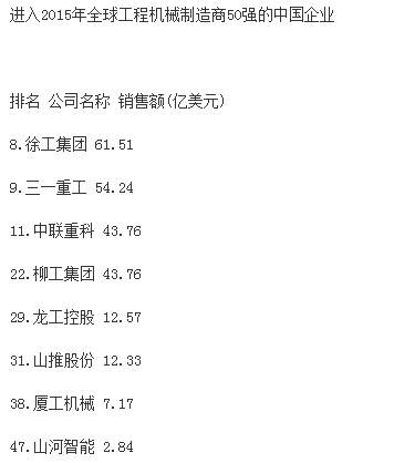 分析指出,受大宗商品價格下跌、新型經(jīng)濟體經(jīng)濟增速減緩和世界經(jīng)濟不景氣的影響,全球前50家工程機械制造企業(yè)總產(chǎn)值較上一年度下跌16.2%,達(dá)到1330億美元,創(chuàng)2009年以來新低。據(jù)中國工程機械商貿(mào)網(wǎng)編輯了解,2009年,工程機械行業(yè)一年銷售額下降了1090億美元。自那時起,工程機械行業(yè)收入下降趨勢一直未有改變。報告同時強調(diào),榜單上下滑最為嚴(yán)重的是中國企業(yè),這很大程度上是因為中國經(jīng)濟增速的放緩。中國企業(yè)中,只有徐工集團(tuán)仍然保持在前十強,位列榜單第九位。“這個市場趨勢表現(xiàn)最顯著的就是中國建筑設(shè)備制造商,相比去年,所有中國企業(yè)的排名有所下滑。排名前十的企業(yè)中,如今只有徐工一家中國工程機械制造廠商?!?/span>
