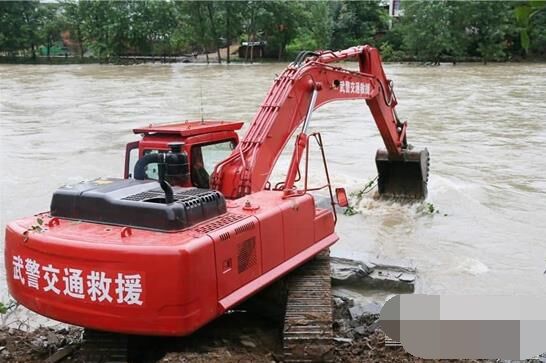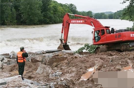 裝載機和挖掘機不停挖土并傾倒在河床上,山頂滑下來的巨石被填筑在路基邊坡,加固道路,保障安全,推土機在后方盡量推平直到可以供車輛行人行走,這是一幅抗洪救災(zāi)現(xiàn)場最常見的畫面,通力合作的除了武警官兵和救援人員們,就屬這些工程機械設(shè)備最為搶眼了。