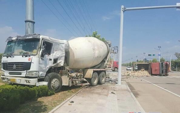 近日,劉某駕駛混凝土攪拌車經過十字路口時闖紅燈,與一輛拉載石塊的大貨車相撞,導致石塊散落一地,兩棵行道樹和一根燈桿被撞倒。