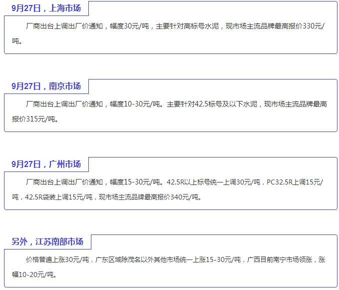 混凝土方面,華東地區(qū)臺(tái)風(fēng)過(guò)后,天氣轉(zhuǎn)好,市場(chǎng)需求小幅提升,但混凝土行業(yè)競(jìng)爭(zhēng)激烈,商混提價(jià)困難,目前持續(xù)穩(wěn)定運(yùn)行。據(jù)9、10月是傳統(tǒng)旺季,預(yù)計(jì)國(guó)慶節(jié)后江浙滬地區(qū)商混價(jià)格有小幅上漲。