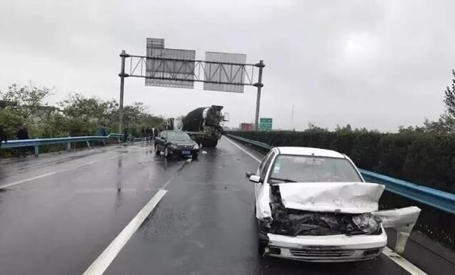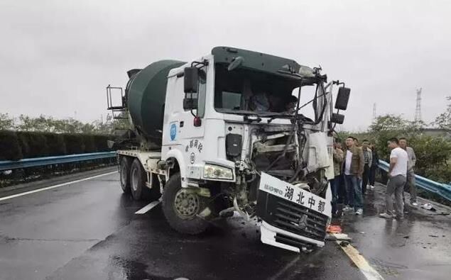 沒想到,隨后而來的一輛水泥攪拌車,經(jīng)過事發(fā)路段,也因為道路濕滑,視線不佳,來不及避讓事故車輛,駕駛員猛打方向,直接撞上了邊護(hù)欄,巨大的沖擊力讓水泥攪拌車直接來了個近180度的大轉(zhuǎn)彎,逆向停在了兩條行車道之間,車輛前臉和駕駛室受損嚴(yán)重,所幸駕駛員只是受了輕傷。由于事故車輛將兩條行車道全部占據(jù),一時間二廣高速車輛出現(xiàn)滯留。