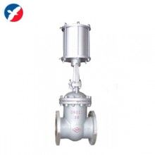 氣動閘板閥主要由氣缸、框架、閘板、絲桿、螺母等零件構成,氣缸帶著絲桿螺母和閘板沿水平方向往復運動,達到閘門的啟閉目的。