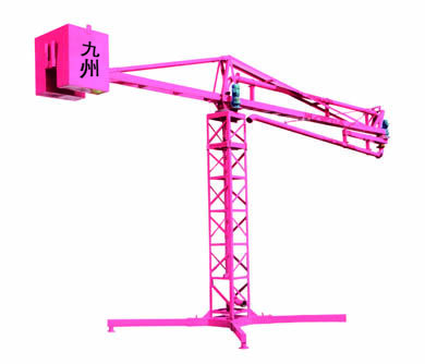 布料機專利設計的膠帶機頭部清掃器是為輸送混凝土清掃砂漿的特殊要求設計的。刮刀采用硬質合金材料,矩型段面,耐磨且不傷膠帶,砂漿損失小。上料膠帶機設計為由兩節(jié)輕型桁架的鉸接結構,上端鉸接在車架上的轉料斗上,通過鉸接油缸根據(jù)需要調整兩節(jié)桁架之間的角度;在膠帶機的下部,設計有萬向輪,在油缸的驅動下可沿桁架軸向移動,可調整膠帶尾部的高度。