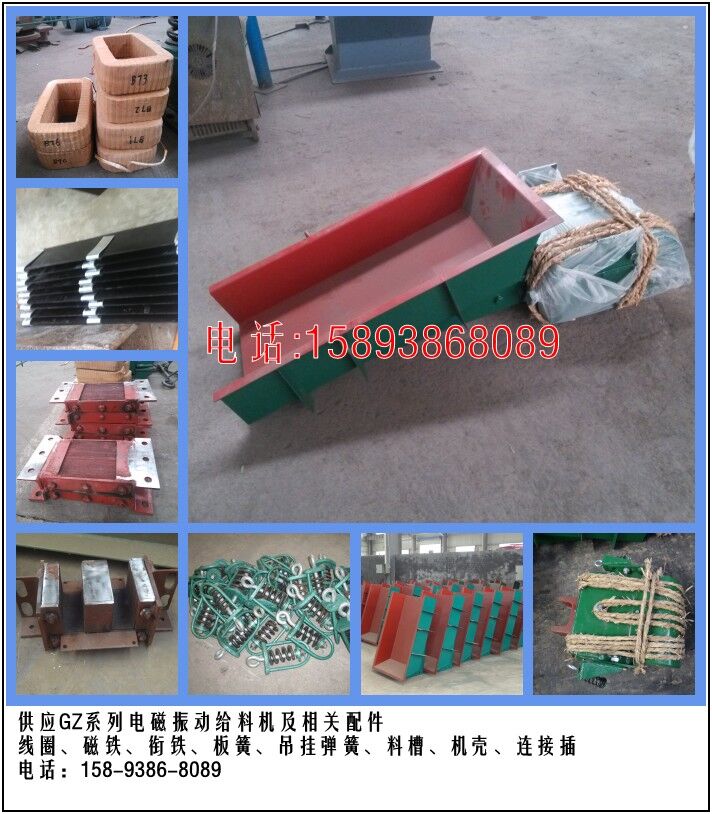 1.板彈簧組:振動器板彈簧是電磁振動給料機的儲能系統(tǒng)。它一般由60Si2Mn制成。彈簧板中部用一螺栓夾在連接叉中,兩端各用一螺栓夾在機殼上,構(gòu)成機器的彈性系統(tǒng)。板彈簧電磁振動給料機,通常利用增加或者減少板彈簧片數(shù)的方法來調(diào)整機器的頻率比。