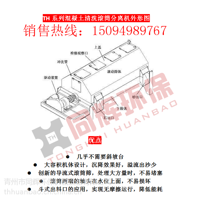 該裝置機(jī)械結(jié)構(gòu)簡單,環(huán)保效益顯著:分離出砂石表面光潔,砂子含灰≤1%,含水≤3-5%;洗車水循環(huán)使用,污水達(dá)到零的排放;設(shè)備耐磨,操作簡單,便于清理檢修。
