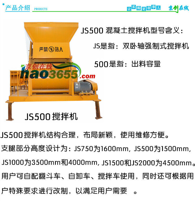 JS500雙臥軸強(qiáng)制式攪拌機(jī) 攪拌系統(tǒng)分別由電機(jī)、皮帶輪、減速箱、齒輪、攪拌裝置、攪拌筒等組成。