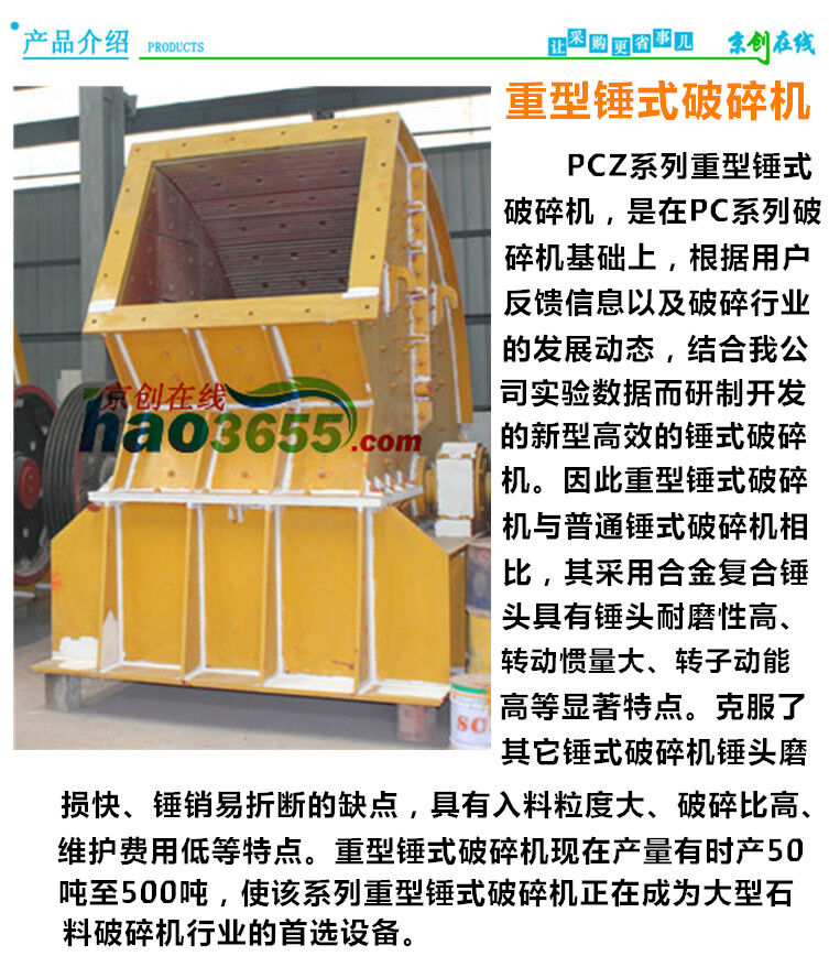 PCZ系列重型錘式破碎機PCZ-1308具有運行成本低,配套功率小,生產(chǎn)成本低,喂料粒度大,破碎比大,產(chǎn)品粒度小等優(yōu)點,是礦山界廣泛使用的破碎設(shè)備。