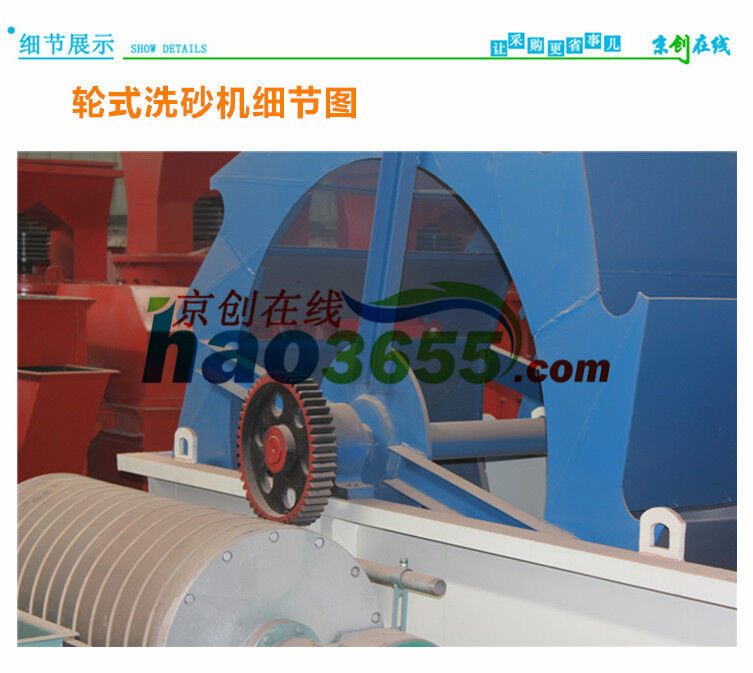 工作時(shí),電機(jī)通過(guò)三角帶、減速機(jī)、齒輪減速后帶動(dòng)葉輪緩慢轉(zhuǎn)動(dòng),砂石有給料槽進(jìn)入洗槽中,在葉輪的帶動(dòng)下翻滾,并互相研磨,除去覆蓋砂石表面的雜質(zhì),同時(shí)破壞包覆砂粒的水汽層,以利于脫水;同時(shí)加水,形成強(qiáng)大水流,及時(shí)將雜質(zhì)及比重小的異物帶走,并從溢出口洗槽排出,完成清洗作用。干凈的砂石由葉片帶走,最后砂石從旋轉(zhuǎn)的葉輪倒入出料槽,完成砂石的清洗作用。