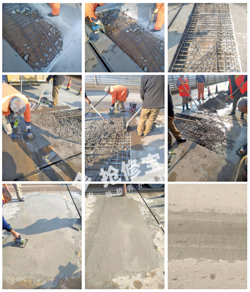 快速修補橋面公路的施工流程:修補基面處理——計算材料用量——材料攪拌振搗 抹面壓光——灑水養(yǎng)生——達到設計強度70%時開放交通