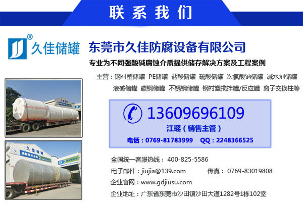 找質(zhì)量上乘、服務(wù)一流的鋼襯塑樹脂罐攪拌罐供應(yīng)商,選東莞市久佳防腐設(shè)備有限公司,公司是華南地區(qū)知名的防腐鋼襯塑攪拌罐生產(chǎn)廠家,引進(jìn)國(guó)外先進(jìn)的技術(shù)設(shè)備以及滾塑工藝,品質(zhì)保證。生產(chǎn)的防腐攪拌罐、鋼襯塑儲(chǔ)罐具有無(wú)焊接縫、不滲漏、耐腐蝕,抗老化,抗沖擊,表面光滑結(jié)合力強(qiáng)。對(duì)一般酸堿鹽的有機(jī)溶劑性能良好,適用于腐蝕性氣體,液體及固體液,漿液介質(zhì)的攪拌以及儲(chǔ)存輸送。