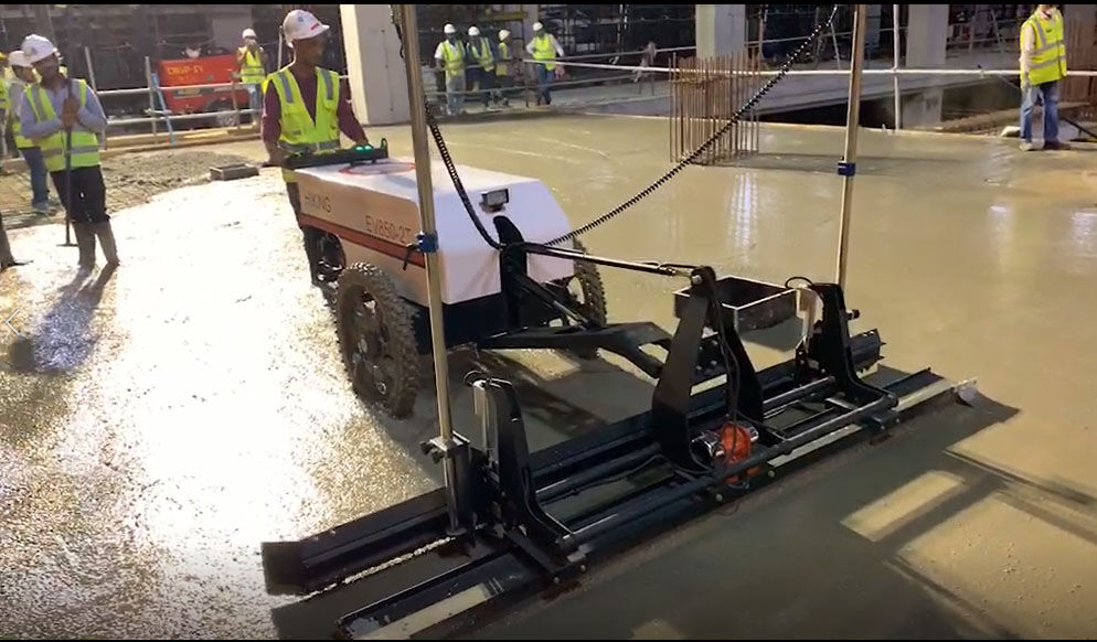 混凝土激光攤鋪機(jī)是用刮板將高出的混凝土帶走并初步刮平,達(dá)到設(shè)計(jì)要求的標(biāo)高。液壓驅(qū)動(dòng)振動(dòng)馬達(dá)產(chǎn)生震動(dòng),頻率為4000次/分鐘,帶動(dòng)整個(gè)振動(dòng)板一起對(duì)混凝土產(chǎn)生振搗。激光攤鋪機(jī)找平不需要拉控制線,也不需要支側(cè)模板來(lái)控制地面標(biāo)高,而由攤鋪機(jī)上的激光測(cè)控系統(tǒng)實(shí)時(shí)控制,只要激光發(fā)射器不受干擾,無(wú)論攤鋪機(jī)移動(dòng)到哪里,都能確保鋪筑后的地面整體上的標(biāo)高不受影響。