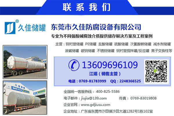 東莞市久佳防腐設(shè)備有限公司主要生產(chǎn)久佳防腐鋼襯塑儲罐、管口一體成型PE儲罐、碳鋼儲罐、不銹鋼儲罐、反應(yīng)釜攪拌罐、離子交換柱、鹽酸/硫酸/酸堿儲罐等五大材質(zhì)100多種規(guī)格,規(guī)模和產(chǎn)品質(zhì)量在國內(nèi)同行處于優(yōu)勢地位。