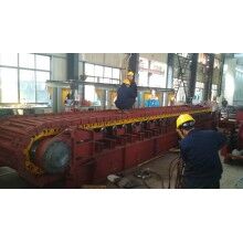 輸送槽由底板,內(nèi)、外側(cè)板與加強(qiáng)梁及托板焊接成剛性槽體。具有耐磨和抗沖撞的特點(diǎn),相互交迭部位采用無(wú)間隙弧形板過(guò)渡,無(wú)論水平與傾斜輸送物料都不會(huì)漏料。