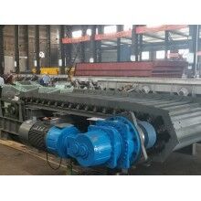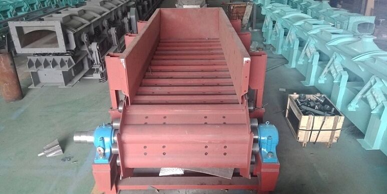 通過分析研究上述問題,結合國內外給料機使用情況,重新設計制作了一臺新型給料機,主要特點是:采用板式給料機連續(xù)給料;板式給料機料板采用雙圓弧、節(jié)點重合的方式,解決了漏料問題;板式給料機安裝角度為18°,可使物料緩慢分散跌落到皮帶機上;撥料棍采用逆物料方向旋轉,以控制物料層的厚度;料斗設計采用漸開式,解決了膨料問題;電機采用變頻控制,可控制出料速度。經(jīng)過三個多月的的現(xiàn)場使用,證明能夠完成勻料,效果較好。