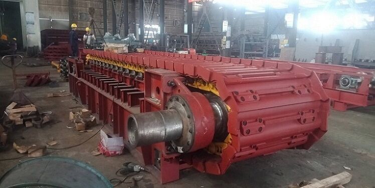 鏈板組件直接承受礦倉物料壓力和運送物料。鏈板組件由輸送板、牽引鏈軌及其聯(lián)接螺栓組成。輸送板采用搭接式結(jié)構(gòu)。輸送板材質(zhì)為高錳鋼,鑄造成型,相互搭接,輸送板用螺栓固定在鏈軌上。這種板不僅重量輕、不漏礦,而且強度高、耐磨損、抗沖擊。