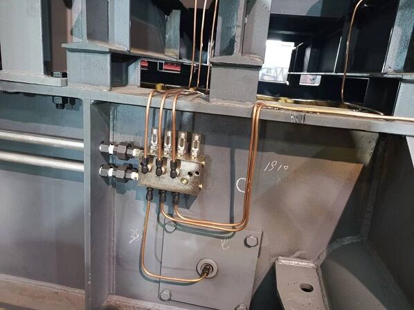 重型板式給料機(jī)潤滑系統(tǒng)由儲油罐、油泵、閥門、潤滑管路、油壓傳感變送器和PLC控制器組成。由于板式給料機(jī)的潤滑口較多,若采用單一管路同時對各潤滑口注入潤滑脂,不但會使油泵的功率和主管路的壓力增加,而且各潤滑口施加的壓力不均勻,影響潤滑效果。因此,本系統(tǒng)采用分段潤滑的方法,用電磁閥控制各個潤滑管路。該系統(tǒng)有油泵電.機(jī),油壓傳感變送器,潤滑管路總閥門,4個分段潤滑管路分閥門等組成。由于電磁閥安全、控制方便,可靠性高,系統(tǒng)均采用電磁閥。重型板式給礦機(jī)自動潤滑系統(tǒng)應(yīng)滿足以下控制要求: