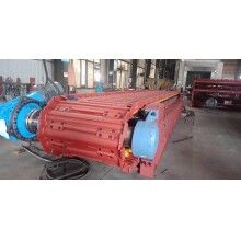 座部件由機(jī)架和支承件組成。機(jī)架由鋼材焊接而成,支承部件有支重輪、下托輪和縱向?qū)к?,輸送板得到支重輪和縱向?qū)к壍碾p重支持,使支重更均勻合理。牽引鏈基本上不受礦石和自重產(chǎn)生的張力作用,支重輪外側(cè)設(shè)計有凸臺,與主、從動輪聯(lián)合作用,成功地杜絕鏈軌跑偏。在機(jī)架下方設(shè)有下托輪,為方便維修,下托輪為側(cè)裝式。
