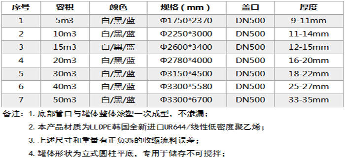 特點:所用材質(zhì)為韓國進口聚乙烯(PE)滾塑原料,儲罐一次成型,內(nèi)外光滑,具有良好的衛(wèi)生性與抗紫外線能力,耐酸堿、耐腐蝕、易清洗、不易老化。它可以盛裝在常溫下無機酸、堿、鹽等大部分物質(zhì)及有機物,耐熱耐凍 耐熱耐凍性佳,-5℃—+85℃均可使用