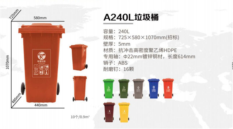 240L塑料垃圾桶/塑料環(huán)衛(wèi)垃圾桶,桶蓋密合,可防止異味散發(fā),雨水侵入,蚊蠅滋生,桶身可相互套疊,方便運輸,節(jié)省儲運空間與費用,桶內外表面光潔,便于倒空垃圾與清洗,垃圾桶設計符合 人體工程學,輕便耐用,移動靈活。產品賣點。240L塑料垃圾桶價格不浪費,讓城市更美觀少占地:生活垃圾中有些物質不易降解,使土地受到嚴重侵蝕。垃圾分類,去掉能回收的,不易降解的物質,減少垃圾數量達50%以上。少環(huán)境污染:廢棄的電池含有金屬。約資源鎘等有害的物質。