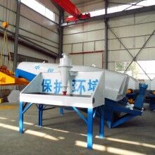 落地式砂石分離機(jī)整套系統(tǒng)主要由:攪拌車加水清洗裝置,溜槽裝置,砂石漿水分離裝置,和泥漿水后處理裝置組成?;炷凛斔驮O(shè)備清洗后,將殘余混凝土排入溜槽中,在高壓水流沖擊下,經(jīng)溜槽進(jìn)入砂石分離機(jī),在不斷旋轉(zhuǎn)的分離機(jī)作用下,對(duì)混凝土進(jìn)行充分的清洗,同時(shí)將砂石、漿水進(jìn)行分離,分離后的砂、石在導(dǎo)料葉片的作用下背向流動(dòng)至出料口排出分離機(jī)落入振動(dòng)篩分機(jī),通過篩分將沙、石子分開,分別堆放。清洗后的漿水從分離機(jī)的溢水口排出進(jìn)入濃漿池,經(jīng)污水泵加壓打到旋流器除去多余固體微粒,降低漿水濃度,進(jìn)入攪拌池回收利用。進(jìn)入攪拌池的漿水為了防止沉淀凝固,需通過攪拌器的作用,攪拌器的工作為間歇式。分離出水泥漿在連續(xù)的攪拌器作用下,再通過高壓污水泵輸送到攪拌樓中待生產(chǎn)再利用。整個(gè)控制系統(tǒng)設(shè)有手動(dòng)和自動(dòng)控制,方便控制設(shè)置,整個(gè)系統(tǒng)運(yùn)行可靠,故障率低,維護(hù)量少等特點(diǎn)。