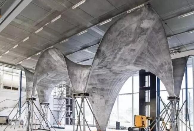 據(jù)了解,工程師們在打造過程中并沒有采用定制、一次性的木頭或泡沫支架,而是使用了他們自己設計的一種新技術。一張鋼索網(wǎng)被拉伸到想要的形狀,然后再在上面放置聚合織物形成一個靈活的模板。之后形狀可以通過算法控制,它能將力均勻地發(fā)布在各鋼索間并決定每個部分所需要的混凝土量。之后,鋼索網(wǎng)可以被拆掉、重復使用和重新調(diào)整。