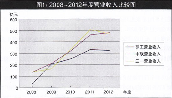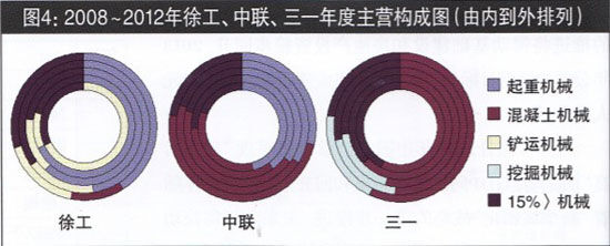 圖4 2008~2012年徐工、中聯(lián)、三一年度主營(yíng)構(gòu)成圖