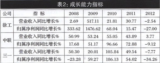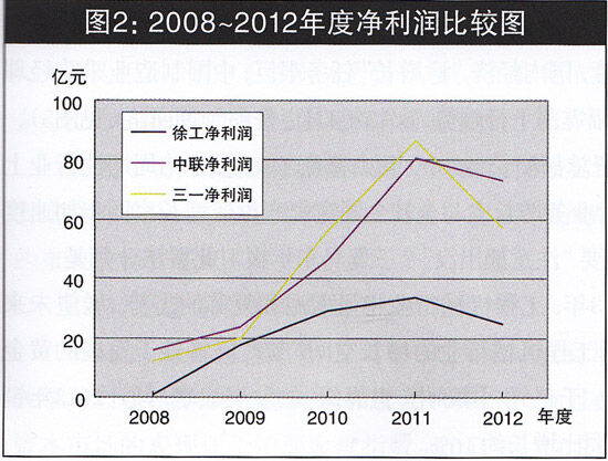 公司的成長(zhǎng)與盈利能力正相關(guān)。在年報(bào)中,主營(yíng)業(yè)務(wù)收入增長(zhǎng)率、凈利潤(rùn)增長(zhǎng)率、凈資產(chǎn)增長(zhǎng)率以及凈資產(chǎn)收益率、毛利率、凈利率等財(cái)務(wù)指標(biāo),是判斷企業(yè)成長(zhǎng)性和盈利能力的重要指標(biāo)。表2顯示,三駕馬車(chē)中,5年主營(yíng)業(yè)務(wù)收入同比增長(zhǎng)率實(shí)現(xiàn)連續(xù)5年正增長(zhǎng)、連續(xù)三年保持30%以上增長(zhǎng)率的公司是中聯(lián),五年中增長(zhǎng)率振幅最大的公司是徐工,2012年徐工和三—主營(yíng)業(yè)務(wù)收入增長(zhǎng)率均出現(xiàn)負(fù)增長(zhǎng);表2還顯示,凈利潤(rùn)同比增長(zhǎng)率方面,沒(méi)有—家公司連續(xù)五年正增長(zhǎng),2012年三駕馬車(chē)同時(shí)出現(xiàn)負(fù)增長(zhǎng),三一錄得-34.26%的最大降幅。在大環(huán)境不利因素作用下,公司成長(zhǎng)性受到嚴(yán)峻挑戰(zhàn)(見(jiàn)圖2)。