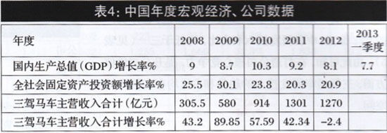 在連續(xù)多年保持高速增長(zhǎng)之后,三駕馬車(chē)內(nèi)部約宅因素增多、外部環(huán)境嚴(yán)峻等狀況,均在年報(bào)中得到反映.其多項(xiàng)財(cái)務(wù)指標(biāo)出現(xiàn)回落趨勢(shì)。企業(yè)發(fā)展到于—個(gè)臨界點(diǎn),調(diào)整發(fā)展戰(zhàn)略的時(shí)間窗口已經(jīng)開(kāi)啟。