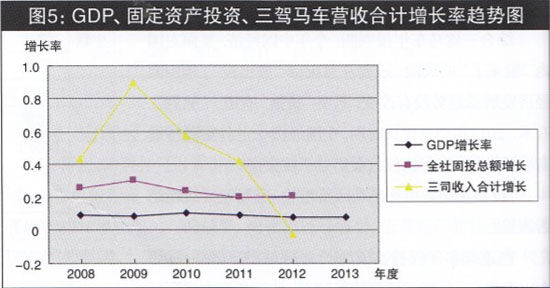 圖5 GDP、固定資產(chǎn)投資、三駕馬車(chē)營(yíng)收合計(jì)增長(zhǎng)率趨勢(shì)圖