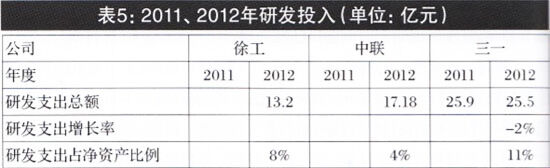 分析2011、2012年報(bào)表明,三一2012年研發(fā)投入25.5億元,占公司凈資產(chǎn)的11%,比2011年減少2%,研發(fā)投入出現(xiàn)下降趨勢(shì);2012年,徐工研發(fā)投入13.2億元,占凈資產(chǎn)的8%;中聯(lián)研發(fā)投入17.18億,占凈資產(chǎn)的4%;徐工、中聯(lián)研發(fā)投入和占比,均低于三一(見(jiàn)表5)。由此可知,在打造公司核心競(jìng)爭(zhēng)力,提升公司價(jià)值方面,三駕馬車(chē)研發(fā)投入的趨勢(shì)和占比均存在提升的空間。