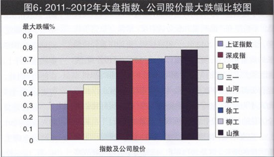 2011年,行業(yè)遭遇寒冬,三駕馬車(chē)營(yíng)業(yè)收入合計(jì)增三率與宏觀(guān)經(jīng)濟(jì)指標(biāo)對(duì)比,呈加速度下跌態(tài)勢(shì),而且在資本市場(chǎng)的表現(xiàn)弱于滬深大盤(pán)指數(shù)。2011年~2012年間,其股價(jià)從最高點(diǎn)至最低點(diǎn),下跌47.3%、61.2%、69.8%不等;而同期上證指數(shù)下跌幅度只有30.67%,深成指下跌42.1%。盡管與行業(yè)內(nèi)其他上市公司同期資本市場(chǎng)表現(xiàn)相比,工程機(jī)械行業(yè)三駕馬車(chē)的表現(xiàn)仍有亮點(diǎn),但其同期跌幅大于上證和深成指跌幅,仍然令公司形象受損,影響資本市場(chǎng)再融資能力。因此,打造公司核心競(jìng)爭(zhēng)力,提升公司投資價(jià)值,提振資本市場(chǎng)投資者信心,至關(guān)重要(大盤(pán)指數(shù)、公司股價(jià)最大跌幅比較圖,見(jiàn)圖6)。