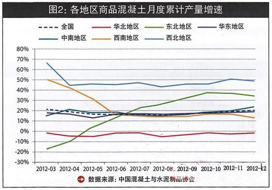 2012年前三季度,房地產(chǎn)調(diào)控和重點(diǎn)在建續(xù)建大型工程項(xiàng)目啟動(dòng)緩慢,商品混凝土市場(chǎng)需求大幅下降,前三季度累計(jì)同比增長(zhǎng)7.9%,到了第四季度增幅有所回升,最終全年增速在11%。