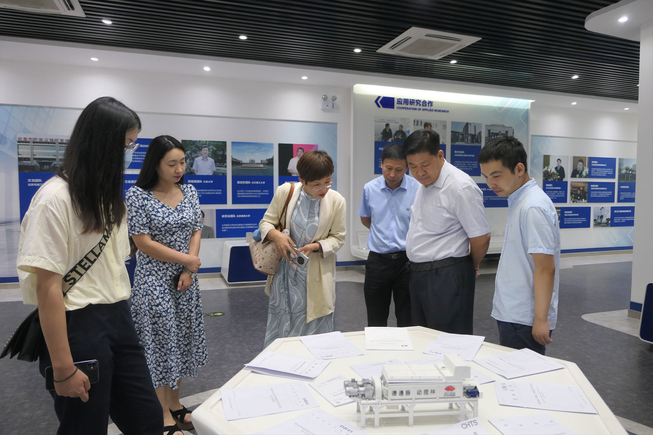 公司副總經(jīng)理孔鮮寧等陪同符忠軒會長一行參觀德通多媒體展廳,匯報振動攪拌技術研發(fā)及應用成果。