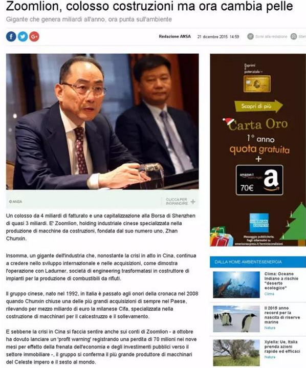 意大利知名國際通訊社安莎通訊社(Agenzia nazionalestampa associata,ANSA)今日在其網(wǎng)站首頁連續(xù)重磅發(fā)布三篇報道,聚焦中國企業(yè)中聯(lián)重科收購意大利領(lǐng)先環(huán)保企業(yè)LADURNER(納都勒)公司,中聯(lián)重科董事長詹純新,公司副總裁、環(huán)境集團總裁張建國接受了安莎社記者的專訪。