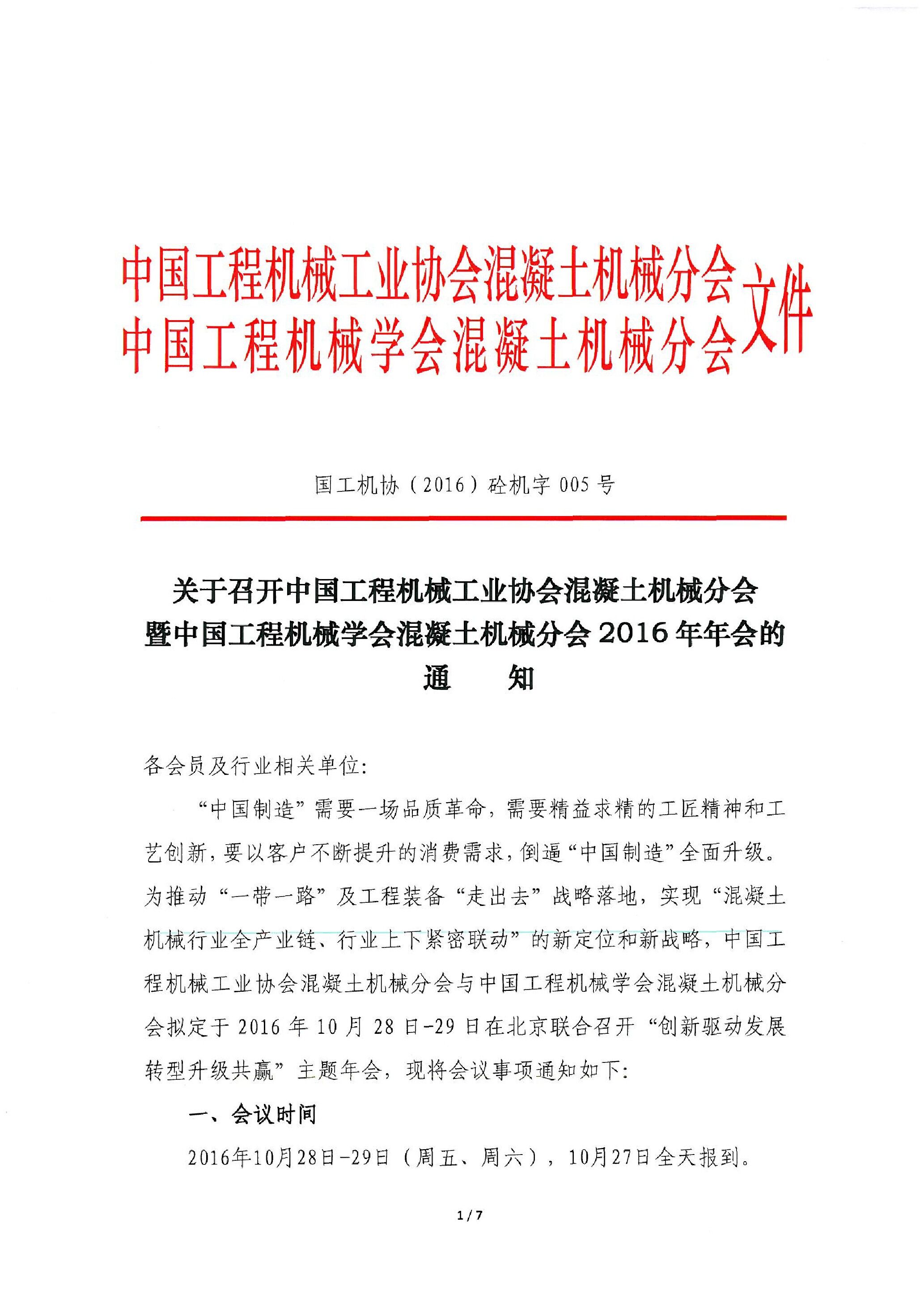 關(guān)于召開中國工程機械工業(yè)協(xié)會混凝土機械分會暨中國工程機械學會混凝土機械分會2016年年會的通知